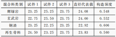 鋪砂法是測定路面的宏觀構(gòu)造深度的一種方法反映路面高速行車時的抗滑性。按照《公路工程瀝青及瀝青混合料試驗規(guī)程》(JTGE20-2011)中鋪砂法的測試方法對輝綠巖、玄武巖、鋼渣和再生骨料等4種集料混合料車轍板進(jìn)行構(gòu)造深度測試,每組3塊試件。在對推鋪形成的圓面進(jìn)行鋼尺測量后,將測得的直徑按照規(guī)范推薦公式進(jìn)行計算,其測試結(jié)果如表1所示,其數(shù)據(jù)展示以及其與粗集料表面構(gòu)造排序的對比。
