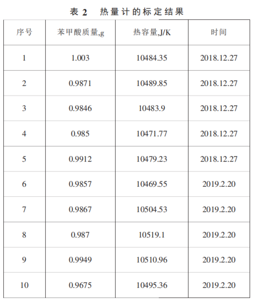 從 表 2 中 可 以 得 出 ,昌吉 熱 量 計(jì) 在 2018 年 12 月 27日標(biāo)定的熱容量平均值為 10481 . 82J / K , 其 相 對(duì) 標(biāo) 準(zhǔn)偏 差 為 0. 06% , 滿 足 GB/ T 213 - 2008 要求的相對(duì)標(biāo)準(zhǔn)偏差 不 超 過 0. 20% 。 從 表 2 中 還 可 以 得 出 , 熱 量 計(jì) 在 2019年 2 月 20 日標(biāo)定的熱容量平均值為 10499. 9J/K, 較 前一次的熱容量差值為 0. 17% , 滿 足 GB/ T 213 - 2008 要 求的熱容量值相差不超過 0. 25% , 另外此次熱容量標(biāo)定的相對(duì)標(biāo)準(zhǔn)偏差為 0 . 18 % , 也 滿 足 GB / T 213 - 2008 的 精密 度 要 求 。